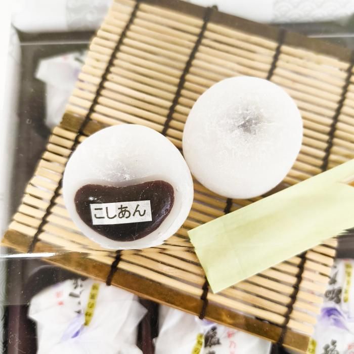 南紀熊野灘の海塩を使用した塩大福です。天日干しで仕上げた手作り海塩は、手作りならではの角がない丸みとあと味として残る甘味が、餡の甘味を引き立てます。個包装なので茶菓子としてもおすすめです。
